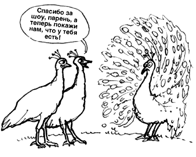 Например, павлину природа дала роскошный, сверкающий хвост, потому что самки этого вида предпочитают самцов с яркими, цветными, пышными хвостами. Самки отвергают павлинов с облезлыми хвостами, потому что хилый самец не сможет дать полноценного потомства. Таков эволюционный эффект выбраковки облезлых самцов – самки просто не хотят спариваться с ними.
