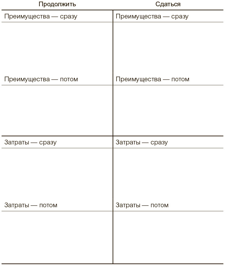 Окинув взглядом эти четыре столбика, примите решение, которое даст вам максимум преимуществ и потребует минимум затрат. Запишите как долгосрочные, так и краткосрочные последствия. А если все-таки решите продолжать, не забудьте поставить в свое расписание пару техник для завершения цикла.