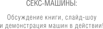 Основатель центра – неугомонный и пылкий Кэрол Куин, исследователь сексуальной культуры, выходит, чтобы обратиться к присутствующим («Леди, джентльмены и все остальные!»), которые теперь прошли внутрь и расселись на стулья. Куин представляет Тимоти Арчибальда – фотографа, снимавшего секс-машины. Арчибальд одет в мешковатые оранжевые штаны, какие носят художники, и красную рубашку-шотландку. Он держит бутылку «Короны» и машинально поднимает руку, прикасаясь к своей обритой голове. С лица Арчибальда не сходит рассеянная улыбка. Нетрудно понять, почему создатели машин весьма любезно согласились позировать для него. Арчибальд – уважаемый фотограф, специализируется на изящных искусствах, его книга (без шуток, на самом деле) – это художественный фотоальбом. Никто не сфотографирован за использованием машины; фотографии – это портреты изобретателей (все они мужчины) у себя дома или в гараже, позирующих возле своих машин. Мой знакомый редактор газеты, который переслал мне пресс-релиз выставки, также подарил и экземпляр этого альбома, так что он нашел место в нашей гостиной рядом с другими книгами по искусству и пребудет там, пока родители мужа не приедут в гости.