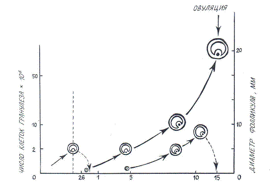 Из первичных, маленьких фолликулов формируется один доминантный – главный, большой. Он напоминает шарик. Внутреннюю поверхность такого шарика выстилают клетки, которые вырабатывают гормоны. В начале цикла шарик имеет диаметр приблизительно 2 мм. В течение 10–14 дней, к моменту овуляции, диаметр его увеличивается до 21 мм. За это время происходит 100-кратное увеличение объема фолликулярной жидкости.