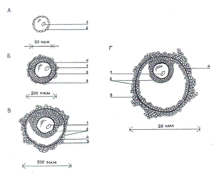 А – примордиальный фолликул; Б – преантральный фолликул; В – антральный фолликул; Г – преовуляторный фолликул;