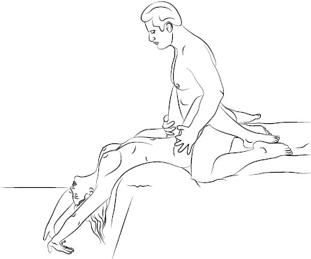 Она ложится головой вперед на край постели. Он встает на колени перед ней, продвигая ее дальше и вводя член внутрь. Лучший способ перейти к этой позиции – сделать это естественно: она должна потянуться, опуская руки вперед с кровати и касаясь кончиками пальцев пола. Изгиб ее спины должен совпасть с изгибом края кровати, чтобы не возникало ненужного напряжения мышц. Он может помочь ей дотянуться до пола, маневрируя ее бедрами; но еще важнее придерживать их, чтобы она не свалилась с кровати. Эта позиция предоставляет ему отличную панораму ее живота и груди, пока она расслабляет тело. Поскольку ее голова теперь ниже туловища, эта прекрасная утренняя гимнастика усилит для нее нарастающую кульминацию. А его положение – прямо перед ее распростертыми бедрами – идеально для глубокого проникновения.