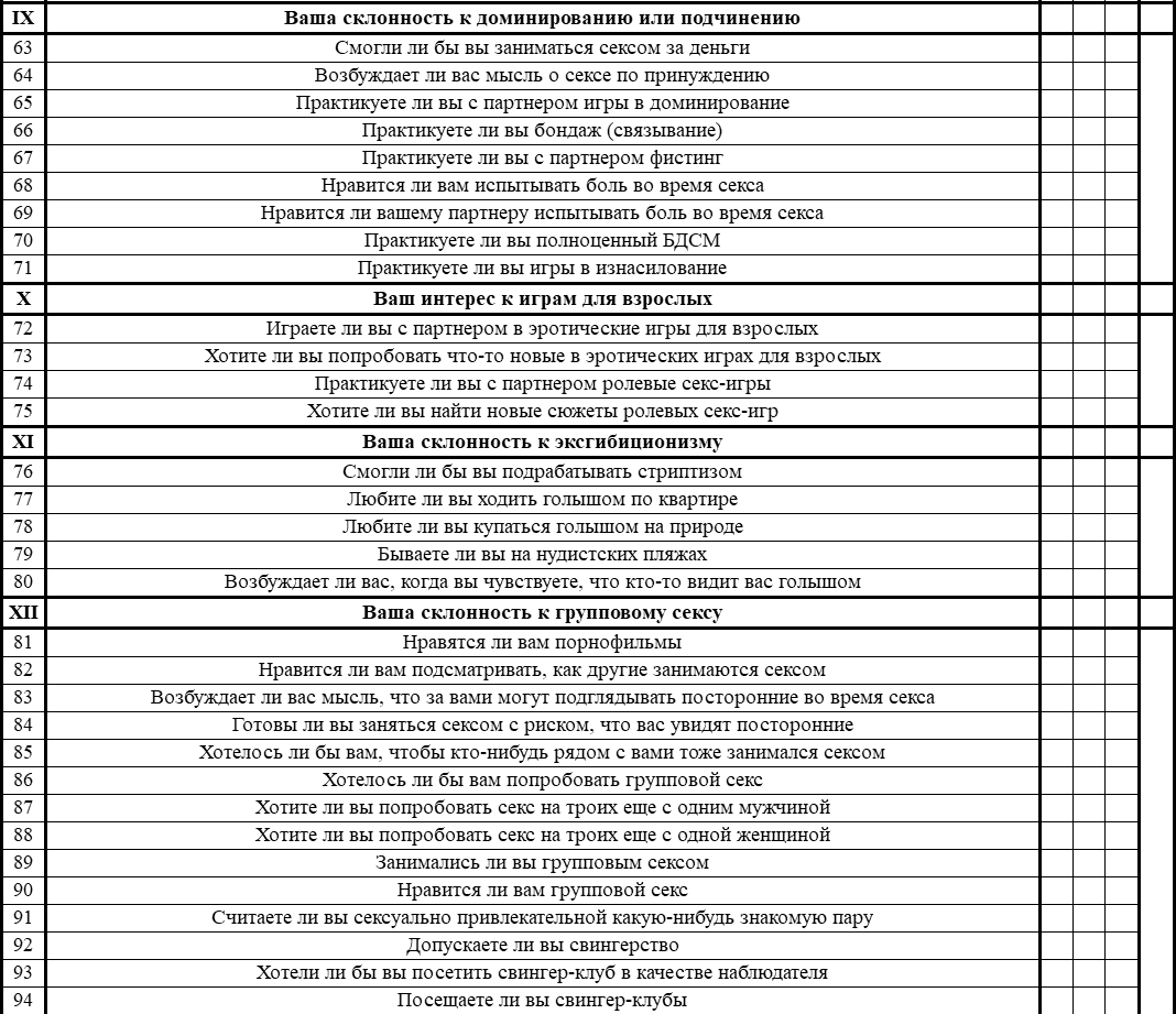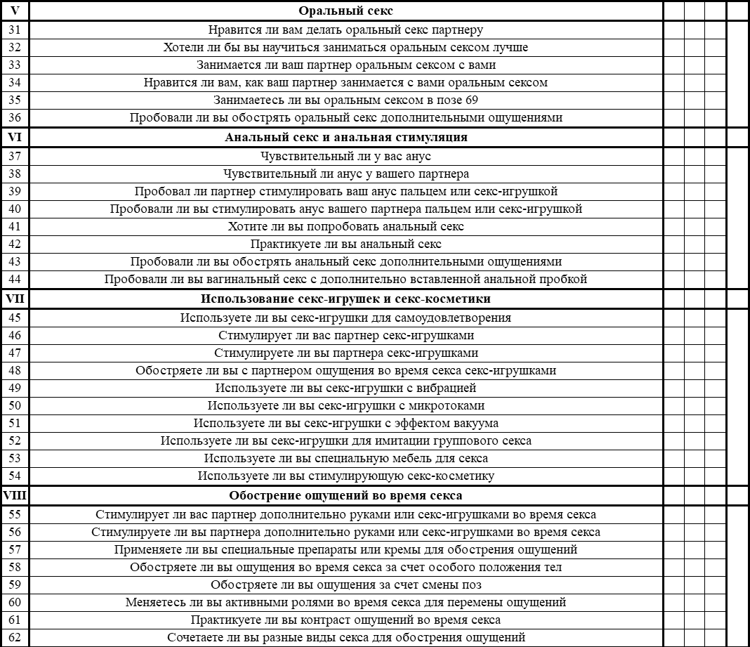 Дня начала стоит оценить собственную сексуальность, проведя некий аудит. Это удобно сделать, заполнив специальную таблицу. Назовем ее «Таблицей сексуальных предпочтений». При желании вы можете скачать файл с этой таблицей с моего сайта www.andreyrider.ru. Это позволит вам распечатать ее для удобства работы. Не пугайтесь, что она такая ёмкая и содержит 100 пунктов. Какие-то из них вы просто пропустите, а какие-то подтолкнут вас к размышлениям. И именно это – задача такого аудита. Он позволит вам почувствовать свой резерв и понять, что он не маленький.