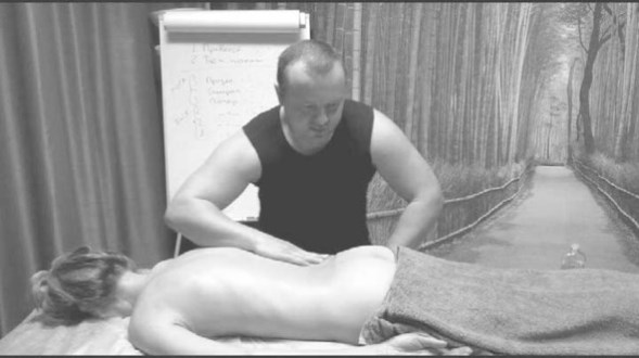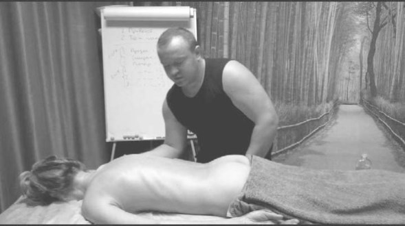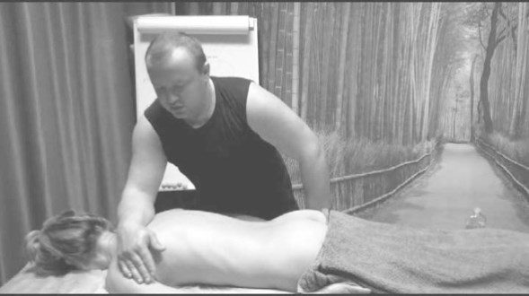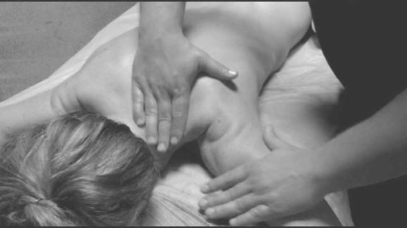 Для выполнения второго приема, встаньте напротив подмышечной впадины. Пальцы во время выполнения приема должны быть выпрямлены! Положите центр (конец ладони — начало пальцев) своей одной кисти на центр дельтовидной мышцы, а центр второй кисти на середину верхней части трапециевидной мышцы, то есть между плечом и шеей. Добавьте немного усилия и совершайте небольшие круговые движения кистями, смещая подлежащие мышцы вперед и назад. Усилие при этом должно быть средним — не доставляющим дискомфорта, но и не слишком поверхностным. Главное, вы должны чувствовать, что мышцы смещаются вслед за движением ваших рук.