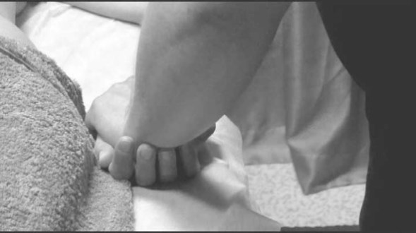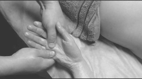 Возьмите ладонь женщины в свои руки так, чтобы Ваши пальцы сошлись на тыльной поверхности кисти женщины. Большой палец дальней от тела женщины руки (вашей) заходит между большим и указательным пальцами женщины. Выполняя разминание круговыми движениями, необходимо стараться сделать так, чтобы пальцы женщины скользили по запястью этой руки.