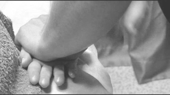 Согните свои четыре пальца, положите кончик мизинца женщины в образовавшуюся ложбинку указательного пальца и прижмите сверху подушкой большого пальца. Выполните выжимание мизинца между указательным и большим пальцами, смещаясь к ладони женщины.