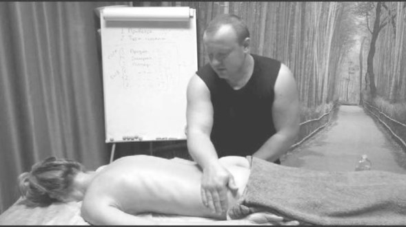 По телу массаж выполняется ладонью и предплечьем. Движение руки начинается от локтя женщины — сначала поглаживание начинает ладонь, а сразу за ней в работу включается предплечье. Рука движется по плечу до надплечья, потом разворачивается и идет вниз, к ягодицам, по ближней к вам половине спины.