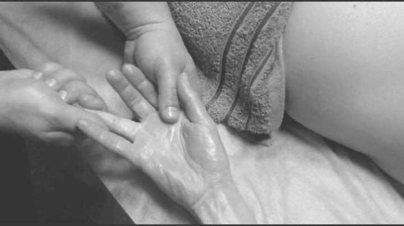 Переходя к массажу внутренней поверхности руки, вы убираете одну свою руку из физической работы — она будет выполнять контактную функцию. Встаньте боком к телу женщины напротив ягодиц. Ладонь той руки, которая ближе к телу женщины, положите на ее ладонь так, чтобы основание вашей ладони легло к началу пальцев женщины. В этом положении ваша ладонь будет находиться все время, пока не вы не дойдете до массажа ладони.