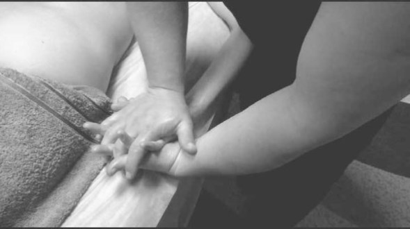 Станьте со стороны головы женщины. Заведите свою кисть под кисть женщины так, чтобы получился контакт ладонь в ладонь, а пальцы женщины оказались на вашем запястье. Ваши предплечья при этом будут создавать одну линию. Выполняя поглаживания по предплечью и кисти, добавьте столько усилия, сколько необходимо для того, чтобы немного смещать руку женщины вперед и назад. Пальцы женщины в этом случае, будут гладить ваше запястье.