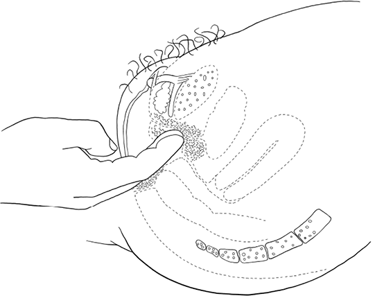 Ущипните ее промежность. При стимуляции ткани промежности изнутри указательным пальцем надавливайте одновременно большим снаружи. Получается, что вы как бы защипываете промежность одновременно снаружи и изнутри.