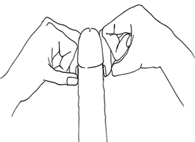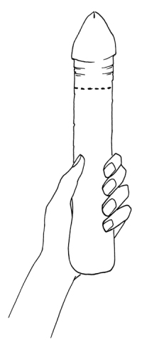 Средние пальцы суставом первой (не ногтевой) фаланги уперли в устье уретры (29 зону), а кончики ногтей должны быть на подвенечной бороздке. Рисуете в месте прикосновения к стволу фаллоса кончиков ногтей круг вокруг ствола.