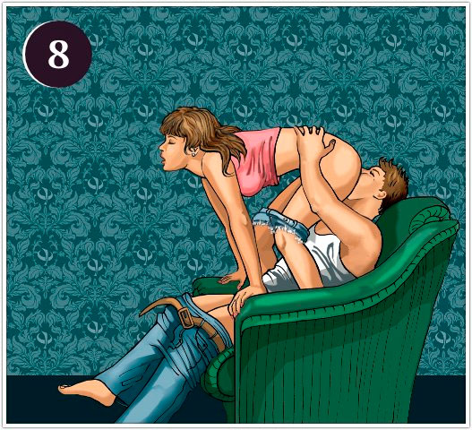 Добавим немного экзотики в куннилингус сзади, перебравшись в кресло. Опираясь на его поручни, женщина старается так прогнуть спину, чтобы ее промежность раскрылась сильнее. При желании она может дотянуться губами до члена партнера, перейдя к экзотическому варианту позы 69.