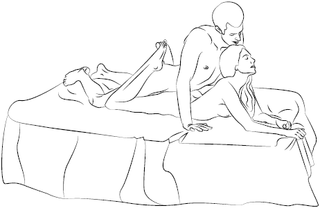 Она ложится лицом вниз, опираясь на локти и разведя ноги. Он располагается позади нее в позе для отжиманий, устраивая свои ноги между ее ног. Когда он наклоняется вперед, она выгибает спину, подпирая головой его подбородок. Она сгибает колени, чтобы обвить ногами его ягодицы. Если этот угол вам неудобен, можно подложить подушку под ее бедра, чтобы приподнять таз для лучшего принятия (в такой позиции важно, чтобы пенис точно попадал туда, куда надо, так что стоит пристроиться удобнее). Пускай в данном случае он воплощает верховную власть, но и у нее есть «право голоса»: она может с помощью ног, которыми обхватывает его ягодицы, притягивать его ближе и встречать его бедра в момент движения.