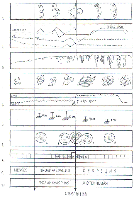 1 – развитие фолликула; 2 – уровень гормонов; 3 – изменение эндометрия; 4 – изменение эпителия влагалища; 5 – изменение базальной температуры; 6 – натяжение цервикальной (шеечной) слизи; 7 – симптом кристаллизации цервикальной слизи; 8 – детородные дни менструального цикла; 9 – маточный цикл; 10 – яичниковая фаза