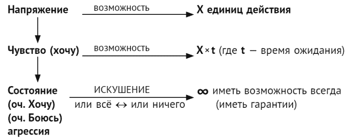 Но когда мы долго терпим и не воплощаем свое «хочу», что с ним происходит? Оно никуда не исчезает, а превращается в «глобальное хочу». Допустим, у вас есть желание, значит, возникает напряжение, и нужно сделать Х единиц действий, чтобы его снять.