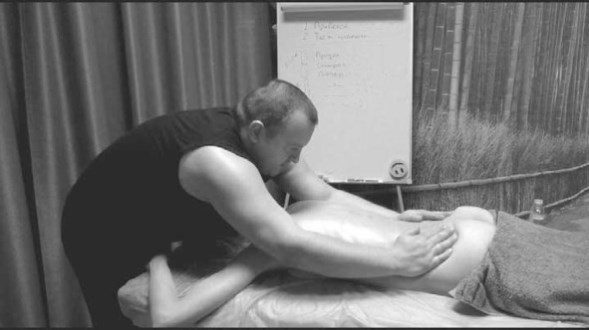 — Упор на крестце. В тот момент, когда ваши руки приближаются к крестцу, то есть находятся в ложбинке на пояснице, прижимаете пальцы, как бы углубляясь в ткани — если женщина не очень полная, то появляется кожная складка перед пальцами, «волна». Ладонь и предплечье прикасаются к телу полностью, но нагрузка сконцентрирована на пальцах. С усилием проводите пальцами по крестцу до межягодичной складки и также, с усилием на пальцах, разводите руки в стороны. Получается так, как будто вы растягиваете верх ягодиц в стороны. Убираете нагрузку и возвращаетесь назад по боковой поверхности.