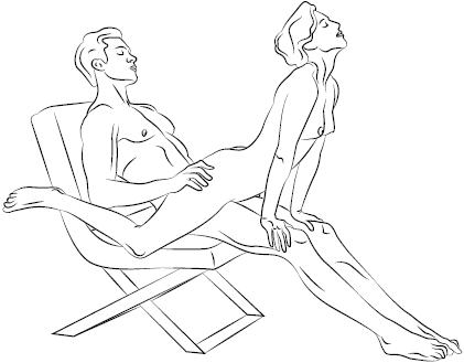 Он сидит в большом кресле. Она садится к нему на колени лицом к его ногам и опускается на пенис. Затем заводит ноги назад по обе стороны кресла, медленно наклоняется вперед, опираясь ладонями о его бедра, и прогибает спину, чтобы усилить движение.