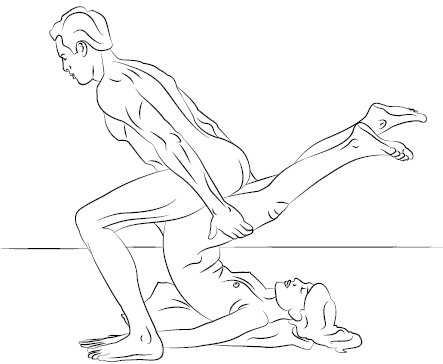 Она ложится на подушку на полу в позу плуга (ноги согнуты в бедрах, нацелены вверх и заведены за голову). Он встает над ее «стартовой площадкой», спиной к ней, и, съезжая по ее бедрам назад и вниз, входит внутрь, пружиня ногами.
