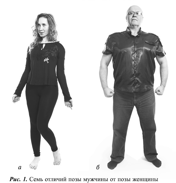 Варианты применения жестов по полоролевому принципу – найди 7 отличий позы мужчины от позы женщины. Посмотрите рис. 1а и рис. 1б. Перечислю отличия.