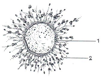 1 – блестящая оболочка, 2 – лучистый венец, образованный фолликулярными клетками
