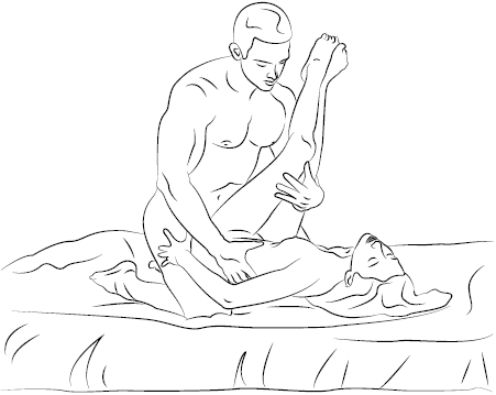 Не требуется никакой акробатики! Она ложится на постель, на пол или на любую поверхность, на которой они не прочь заняться сексом. Он стоит на коленях перед ней, а она пристраивает удобнее ягодицы, встречая его. Обе ее ноги должны быть подняты, но на этот раз речь не идет о состязаниях в гибкости: они могут быть удобно присогнуты и слегка наклонены на сторону, покоясь на его плече. Он придерживает ее ноги одной рукой, другой одновременно направляя ее бедра. В этой позиции она удобно лежит на кровати, что обеспечивает ему доступ к ее грудям и возможность любоваться выражением ее лица («я уже почти там!»). Ее сдвинутые ноги обеспечивают отличную плотную посадку, а угол приподнятых бедер дает возможность глубже войти в нее.