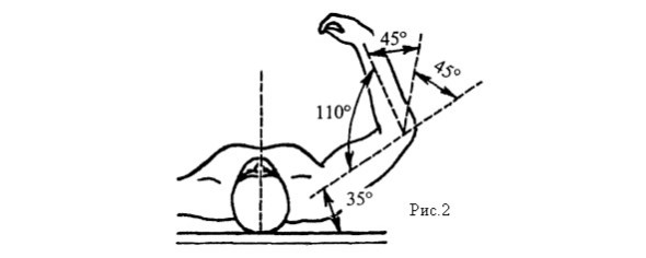 Его еще называют положением физиологического покоя. Относится это определение в первую очередь к конечностям — рукам и ногам в целом и их составляющим в частности. Это состояние характеризуется одинаково расслабленным состоянием мышц антагонистов. Антагонизм — это противостояние. Мышцами антагонистами называют мышцы, выполняющие противоположную работу. Например, на плече (плечо — это участок между локтем и надплечьем) есть бицепс и трицепс, при сокращении бицепса происходит сгибание в локтевом суставе, при сокращении трицепса — разгибание, то есть они выполняют противоположную работу. Так вот, среднее физиологическое положение руки в локтевом суставе будет достигнуто тогда, когда и бицепс, и трицепс будут одинаково расслаблены. Как видно на рис. 2, угол между плечом и предплечьем в этом случае будет составлять примерно 110°.