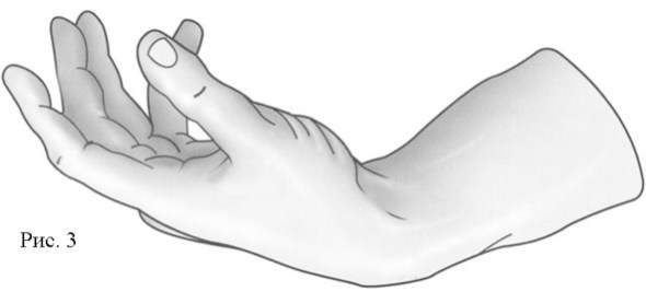 Кроме среднего физиологического положения руки в локтевом суставе, вас будет интересовать среднее физиологическое положение пальцев рук и ног в целом. Ноги, в положении лежа, должны быть расставлены примерно на ширину плеч, это будет состояние, когда мышцы приводящие и отводящие бедро будут в одинаково расслабленном состоянии. Расслабленное положение мышц сгибателей и разгибателей пальцев приведет кисть в положение, указанное на рис. 3.