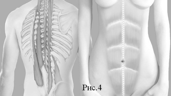 В данном случае я говорю не о постоянном напряжении, нарушающем среднее физиологическое положение, а именно о временном напряжении мышц, причем мышц конкретных. В основном, вас будут интересовать мышцы выпрямляющие позвоночник и мышцы живота (рис. 4).