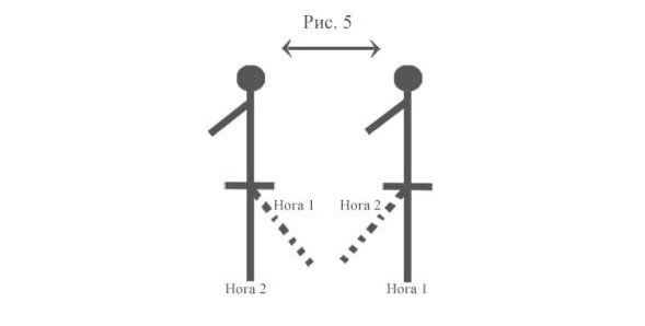 Встаньте на одну ногу (1), выпрямите спину. Вторую ногу (2) немного поднимите и вынесите вперед (рис. 5). Руки держите перед собой так, как будто они лежат на спине женщины. Теперь сместите свой центр тяжести вперед, встаньте на вторую ногу так, чтобы теперь она создавала единую ось со спиной. Первая нога оказывается приподнята и вынесена назад. Вернитесь назад, перенося свой вес опять на первую ногу. Помните, спина и ноги должны все время оставаться выпрямленными! Если вы начнете сгибать хотя бы одну ногу в колене, то маятника не получится.