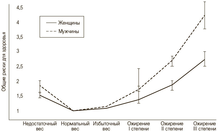 Еще один метаанализ привел и вовсе к удивительным выводам: люди, которые по классификации ИМТ имеют «избыточный вес», могут прожить дольше, чем все остальные категории. А самый высокий риск ожидаемой смертности наблюдается в группе «недостаточного» веса[138].